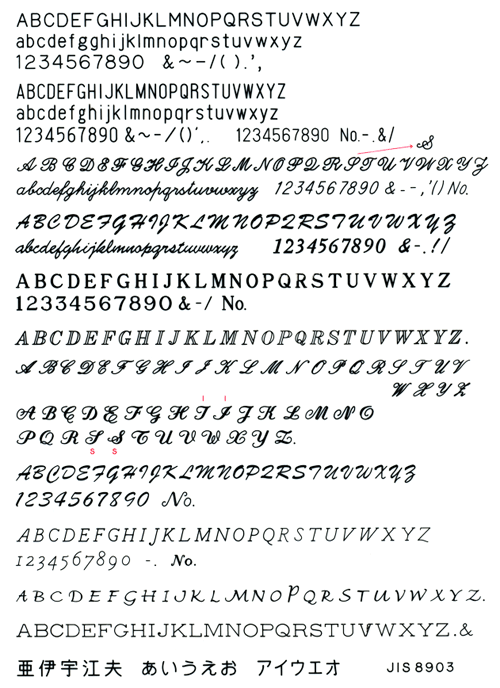 無地のペンなどに英数字書体でな入れ彫刻いたします 書体サンプルの中からお選びください マーク イラストの場合は、別途見積り致します 文字に傾斜をかける事も出来ます。